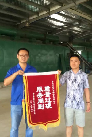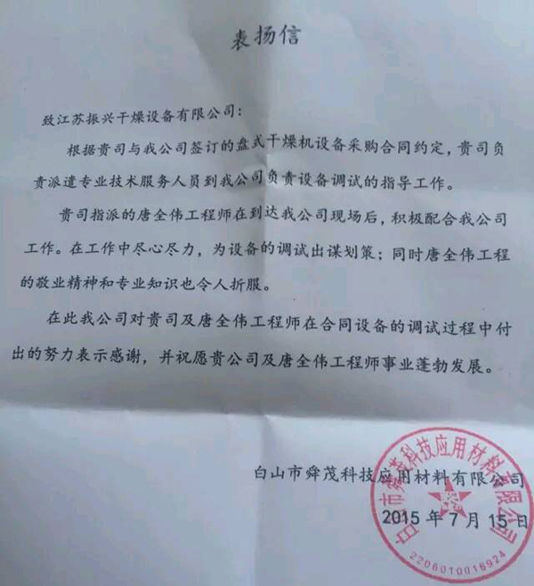 接去年之后,近日我公司售后服务工程师并兼职安装调试的唐全伟又带回来一面锦旗和一封表扬信,锦旗上面写道“质量过硬,服务周到”这一面旗帜,这一句话,却表达了客户对振兴干燥的充分肯定和赞扬。这是对我们售后服务的一种认可,同时也极大的鼓舞了我们的工作热情。我们全体员工为每位客户都要做到“心系客户服务周到”。