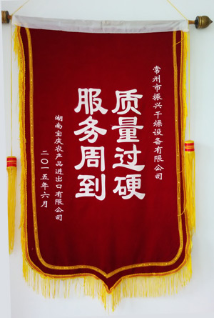 “以质取胜,立信为本”是“振兴”人的一贯宗旨,每位“振兴”人都将这一信条融入到自己每天的工作之中。正如湖南宝庆农产品进出口有限公司锦旗上写的一样——“质量过硬,服务周到”。正是凭借着这样的服务态度振兴干燥才能屡获行业内及广大客户的好评。